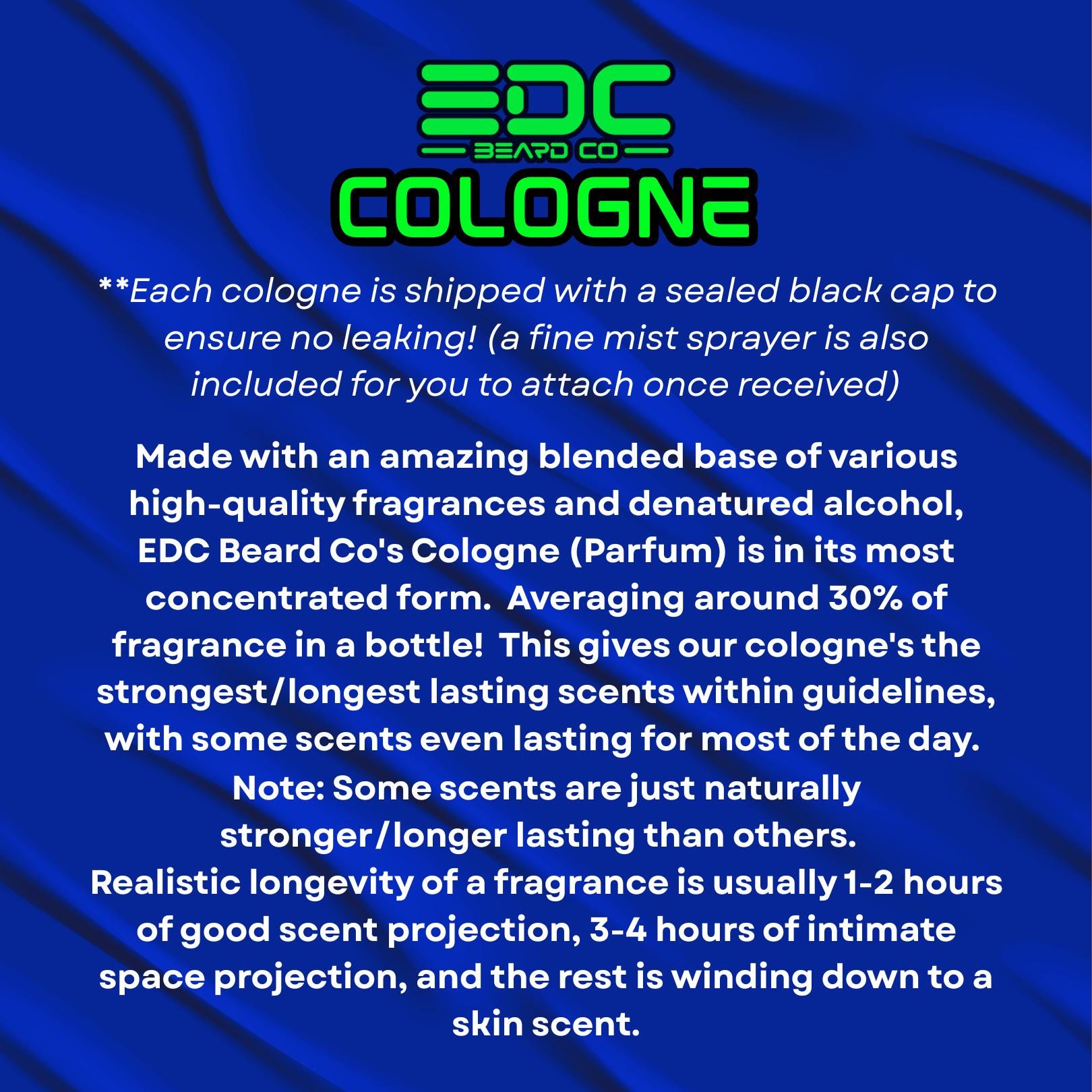 Made with an amazing base of various high-quality fragrances and denatured alcohol, EDC Beard Co's Cologne (Parfum) is in its most concentrated form. Averaging around 30% of fragrance in a bottle! Each cologne is shipped with a sealed black cap to ensure no leaking! (a black spray mister is also included for you to attach once received)